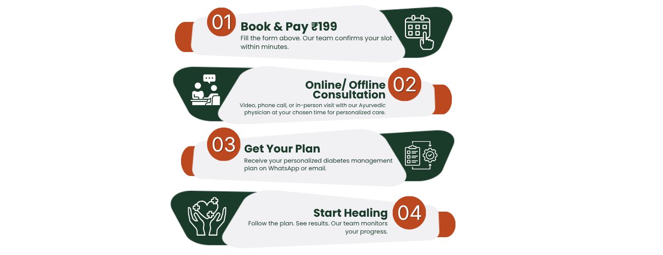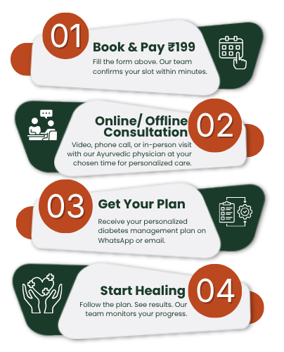 After booking, our team will contact you on WhatsApp to confirm your slot. The consultation happens via video call or phone at your chosen time, lasting 30โ45 minutes with our Ayurvedic physician.